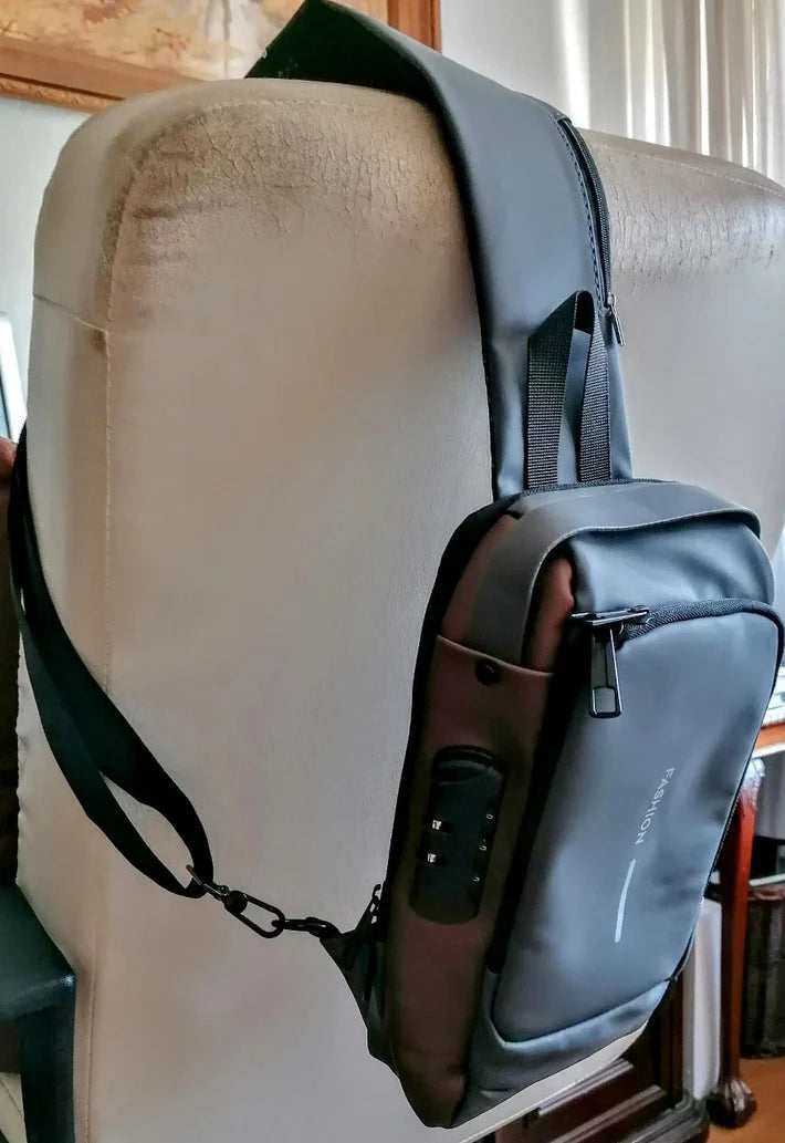 Diseñado con el enfoque en seguridad, creado con materiales resistentes a cortes y al agua, ademas de que cuenta con distintas cremalleras y un gran espacio para cada una de sus pertenencias de valor. Agregando un candando de combinación integrado para poder abrirla. Muchos lo han llamado una caja fuerte andante.
